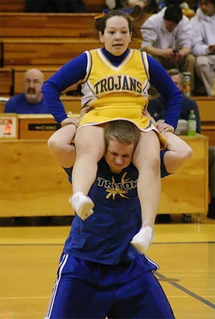 この男性が上の女性を持ち上げることは叶わなさそうですね。今にも女性が落ちそうです!男性のチアリーダーには短所があることがわかります。女性に囲まれながらのチアは常にバラ色ではなく、彼の決まった役割をこなす時間になっているのでしょう。