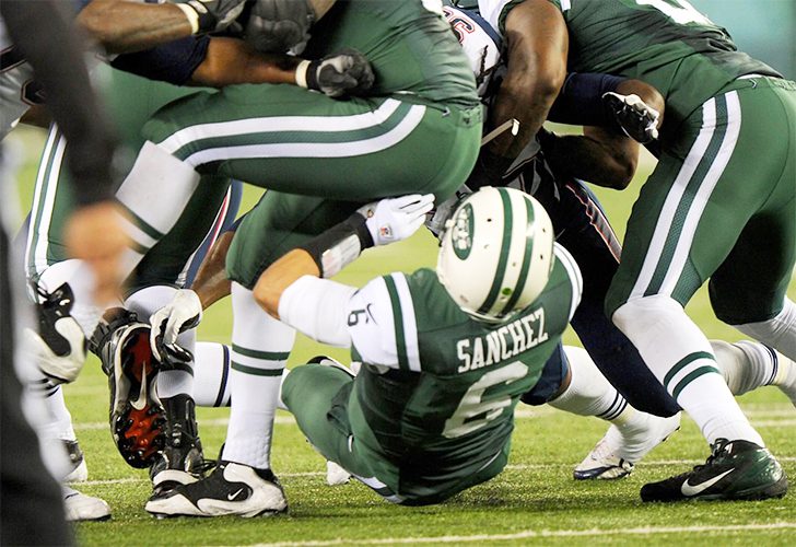 ジェッツのマーク・サンチェスは、この試合でニューイングランド・ペイトリオッツに敗れた主な理由の1つである、彼の信じられないほど有名な**ファンブル(ボールの取り損ね)**に対して、未だに非難を受けることがあります。ご覧のとおり、この写真は10年たった今も面白いスポーツ写真の一つになっています。