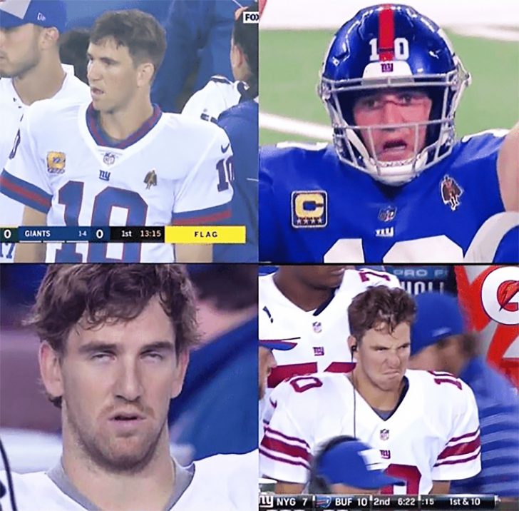 エル・マニングは、2つのまったく異なる事柄で有名です。1つは、スーパーボウルでビル・ベリチックとトム・ブレイディを2回倒したことです。もう一つは、彼の試合における興味深い感情表現です。観客が見て飽きないこの選手は、いつも良い写真を提供してくれるのでカメラマンのお気に入り選手と言っても良いでしょう。
