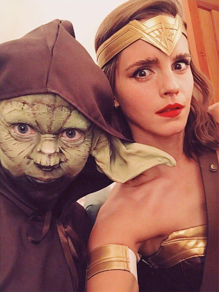 When Emma Watson celebrated Halloween, she fully channeled an iconic heroine. In 2018, for her book club announcement, she shared a photo dressed as Wonder Woman, a perfect nod to her own feminist activism. She’s standing next to a friend in a brilliant, face-painted Yoda costume, creating a hilarious DC/Star Wars mashup!