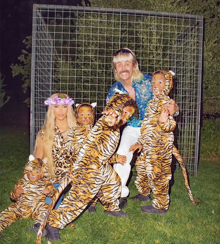 Kim’s look was perfectly on point as Carole Baskin, and she dressed her kids up as adorable tiger cubs, fully committing to the wildly popular theme! Socialite and entrepreneur, Kim, first gained widespread fame when her family’s reality series, “Keeping Up with the Kardashians,” premiered in 2007.