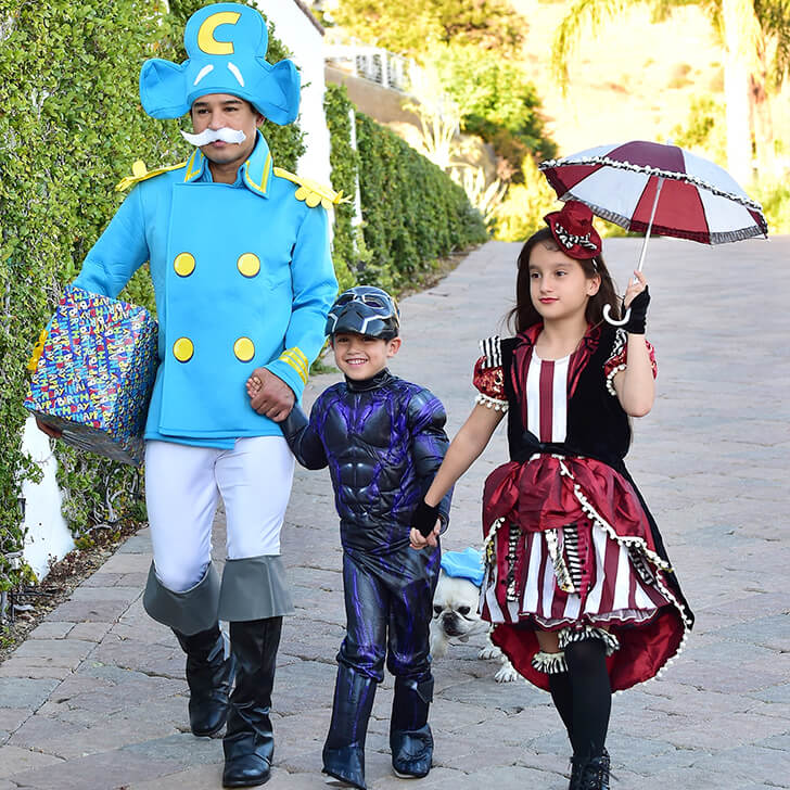 The costume is exceptional due to the meticulous attention to detail, transforming a nostalgic cartoon captain from our breakfast tables into a tangible figure. The look features the bright blue captain’s uniform, along with the character’s signature thick white eyebrows and magnificent moustache. He stands proud and playful, showing off his costume with his kids.