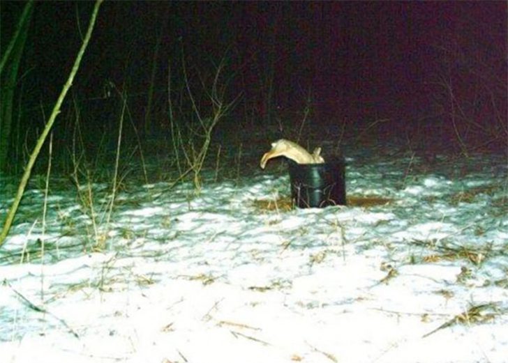 Here’s a hare having what can only be described as a full-on “Alice in Wonderland” moment. With its head buried deep in a black drum, it looks like it’s either searching for an early snack or deciding that this was the perfect time for a random adventure. Either way, it’s clearly all in on whatever mystery this barrel holds.