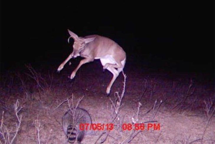 アライグマの突進に驚いたシカが思わず飛び跳ねた瞬間。真相は逆で、シカがアライグマに**“ビビりジャンプ”**を仕掛けた瞬間だったのです。