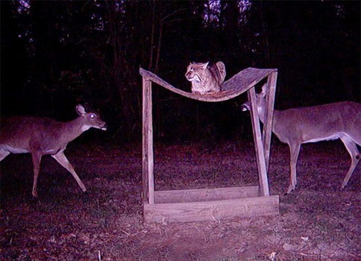 画面中央にいる2匹の子鹿。その向こうに潜むのは夜のハンター、ボブキャット。このボブキャット、古井戸のような構造を利用して、獲物を誘い込んでいた可能性があります。夜の静寂の裏には、完璧に仕組まれた**“食卓”**が用意されていました。