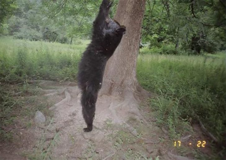 立ち上がってストレッチするクロクマの姿。まるでヨガのポーズのように伸びるその後ろ姿は、クマが四足歩行であることを忘れてしまいそうなほど人間っぽくて不思議です。