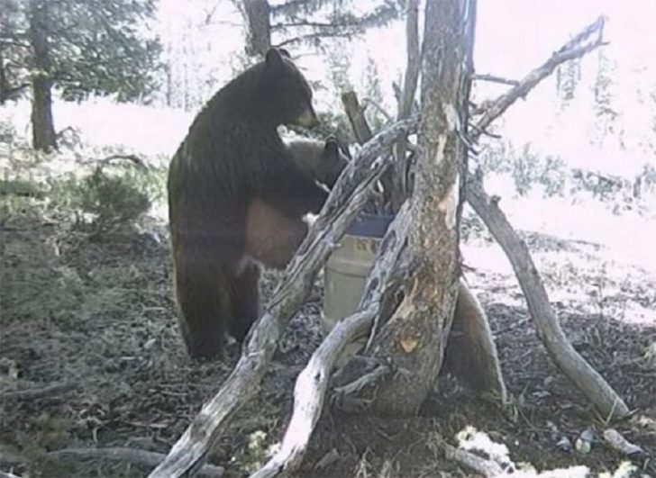 人間の庭に侵入してきたクマの親子。ママグマが子グマを持ち上げて樽の中を覗かせるという、母の愛まで見せてくれた、ほっこり(でも大胆)なワンシーンです。