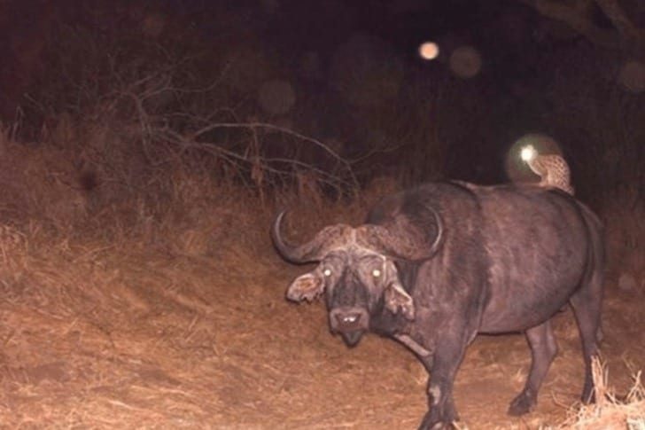 バッファローの背中に乗る、黄色く光る目のジェネットというネコ科の肉食動物。同じジェネットがサイの背中にも乗っていたという奇妙な目撃例もあり、ただの“便乗”ではない何かを企んでいたのかも…?