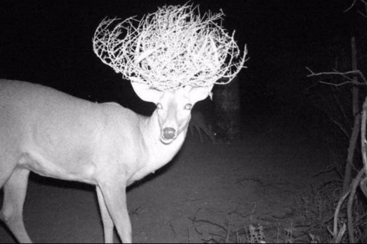 頭のツノに乾いた**“タンブルウィード”が絡みつき、まるで意図的に“王冠”をかぶってるかのような異様な風格を放つシカ。彼こそが「トゲの王」**なのかもしれません。