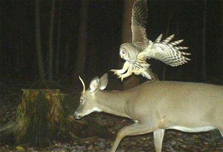 小さなフクロウが巨大なシカに奇襲攻撃を仕掛ける瞬間。シカが自分の**“縄張りの木”**に近づいたのが気に入らなかった様子。フクロウは小さくても、怒らせると鋭いツメでガチ攻撃してきます。