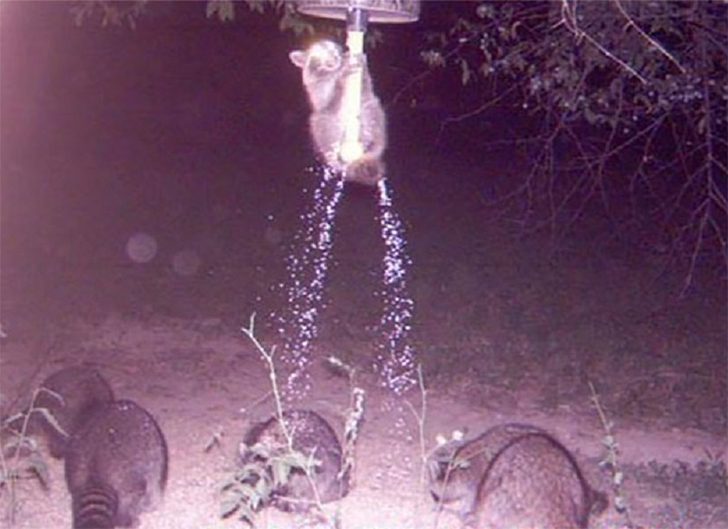 アライグマの集団に現れた怒り心頭のオスが選んだ報復手段は…水かけ!しかし、水辺を好む彼らには逆効果。怒りの**“水まきマン”**の負けかもしれません(笑)。