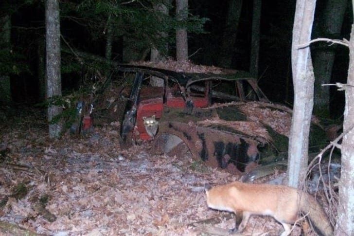 朽ちた車を拠点にするアライグマと、領土を狙うキツネの睨み合い。まるで**“どうなる!?”と続きが気になる映画のワンシーン**のような緊張感です。
